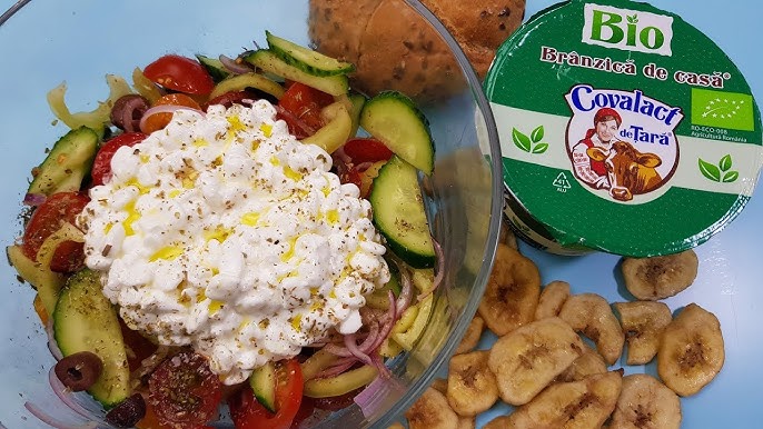 Ca gustare, se potrivește perfect o mână de chipsuri de banane. La servire, se taie roșiile, se amestecă legumele, se adaugă brânzica deasupra, se presară sare și oregano, apoi se asezonează cu ulei de măsline și oțet. Combinația este echilibrată, gustoasă și foarte sățioasă.
