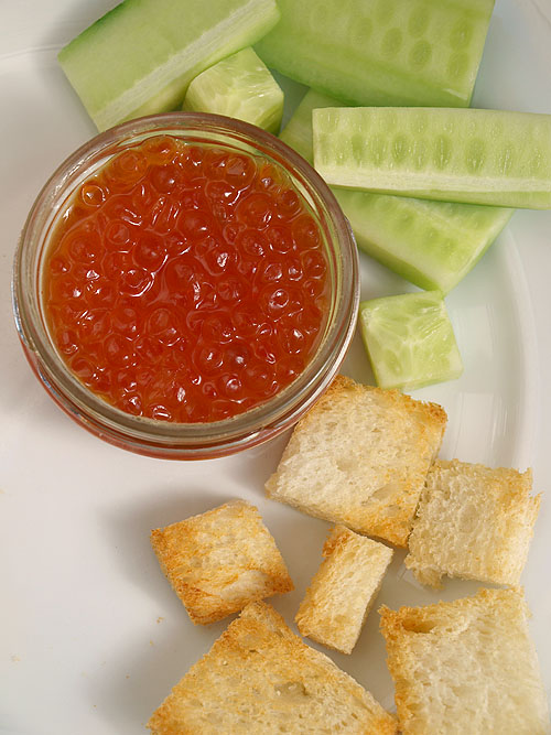 Va propun un aperitiv sau o gustare lejera dar satioasa si racoroasa, pentru zilele caniculare care vor veni. Finetea somonului se imbina perfect cu gustul proaspat si reinprospatant al castravetelui, iar daca veti pregati aceasta reteta , foarte simpla de altfel, atunci cand aveti musafiri, sigur ii veti impresiona. Ingrediente: 1 felie de paine pragita 1 file de somon afumat 1 lingura ulei de masline extravirgin frunze de patrunjel, marar 1 castravete piper prospat macinat putina zeama de lamaie doua-trei lingurite icre de somon Voi puteti sa aranjati aperitivul cum va taie imaginatia, dar eu va povestesc cum am facut eu. Am taiat painea prajita in patrate egale. Apoi am taiat castravetele in cuburi mari (2,5 cm ). Am invelit cuburile de castravete in fasii de somon si le-am asezat pe cate o feliuta de paine. Pentru ca sa nu se desfaca si pentru o servire usoara, le-am asigurat cu niste scobitori. Le-am lasat la o parte. Am amestecat uleiuld e masline cu patrunjel tocat foarte marunt, cateva picaturi de zeama de lamaie si piper proaspat macinat. Cu dressingul astfel obtinut, am stropit cuburile de mai sus. Am decorat cu icre de somon si frunze de marar! Simplu , delicios si elegant! Se serveste imediat sau se patreza cateva ore la frigider. 100 de g de aperitiv cu somon afumat si icre contine: 198 calorii, 16, 2 g proteine, 10,1 g lipide, 2,3 g carbohidrati Pofta buna! Distribuie articolul pe: