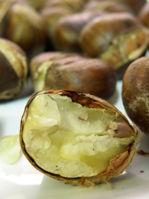Am dat peste castane comestibile intr-un supermarket si nu am putut rezista tentatiei. Am cautat pe internet pentru voi si am aflat ca aceste minunate comori ale toamnei sunt o sursa importanta de vitamine si minerale si contin protide, calciu, fier, magneziu si potasiu. De asemena am aflat ca se numara printre putinele alimente care isi pastreaza proprietatile daca le prelucram termic. Au si numeroase intrebuintari terapeutice asupra carora nu am competente sa ma pronunt dar va invit sa va informati pentru ca nu sunt de loc de neglijat. Datorita numeroaselor calitati pe care le au, castanele comestibile sunt frecvent gasite in unele diete. Ele au un continut foarte scazut de colesterol si au o functie importanta in reglarea digestiei. Din aceste motive, sunt o alegere perfecta pentru persoanele care vor sa isi pastreze silueta. Ce trebuie sa facem pentru a ne umple casa de miros de castane coapte? Nimic mai simplu. Cumparati castane. Cate doriti. Le crapati cu cutitul pe o parte. Atentie sa nu va taiati. Este necesar sa facem acest lucru pentru ca altfel vor exploda. Apa din castane, in contact cu temperatura inalta, va creste presiunea sub coaja si vor exploda! Le-am punti pe aragaz intr-o oala de tuci la foc mare. Le miscati din cand in cand cu o lingura de lemn sa se faca bine pe toate partile. Eu nu le-am tinut pe foc mai mult de 10 minute. Coaja trebuie sa se intareasca si sa devina casanta, iar crapaturile facute cu cutitul sa se deschida putin. In mod normal ele se coc pe jar in niste site metalice care se scutura periodic, dar cum eu nu am dispus de asa ceva, am improvizat. Si s-au copt perfect. Nu va pot descrie gustul, aroma si mirosul, tebuie sa incercati! Va doresc o toamna frumoasa si imbelsugata! 100 de grame de castane coapte contin: 200 calorii, 3 gr proteine, 2 gr. lipide, 34 gr carbohidrati. Tips: daca le decojim si le maruntim, putem sa le aduagam in prajituri sau salate Pofta buna! Distribuie articolul pe: