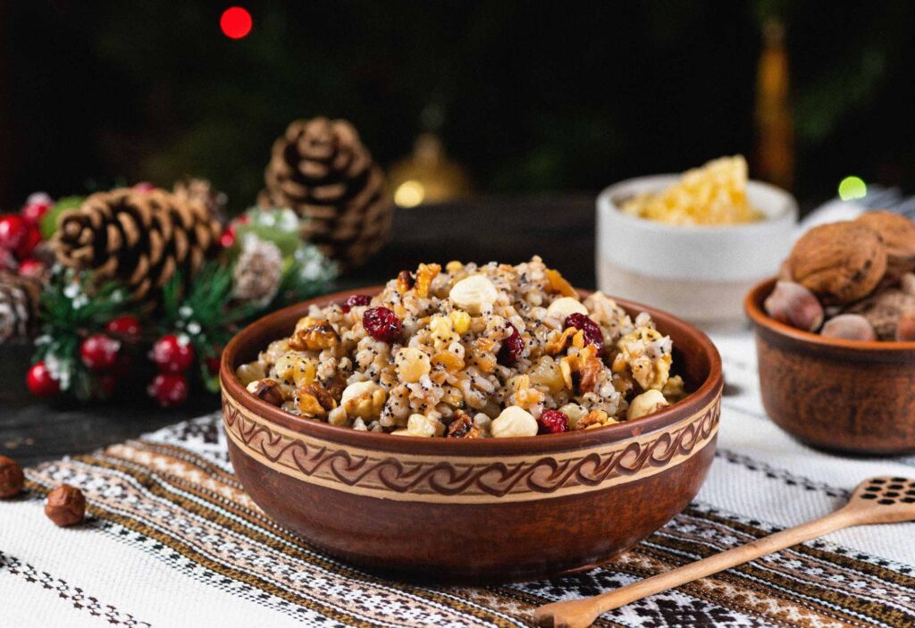 În fiecare colț al mesei este pus câte un cățel de usturoi, despre care tradiția spune că are rol protector, alungând bolile și spiritele rele. Preparatul central este kut’ja, un terci dulce obținut din grâu fiert, miere, semințe de susan și, uneori, alune.