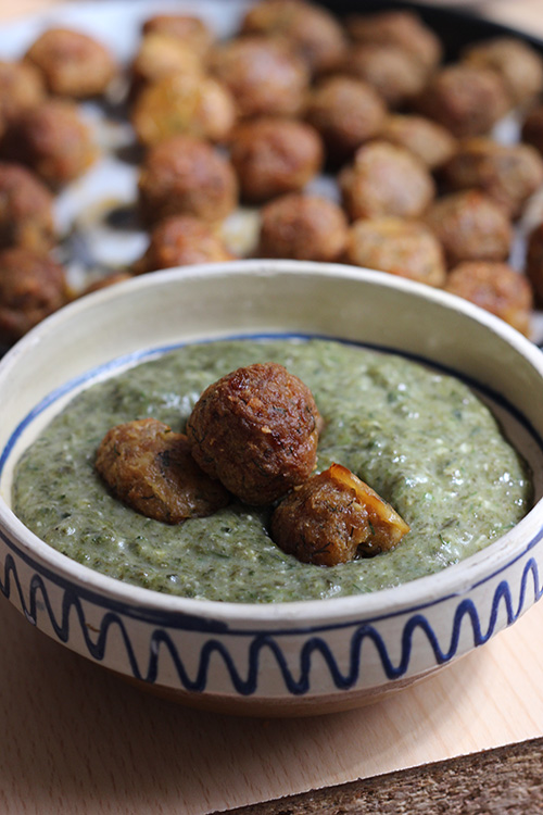 Este sezonul in care gasim spanac proaspat in toate pietele s,i este pacat sa nu profitam de moment. Spanacul  contine foarte multe vitamine si minerale si il putem prepara in mai multe feluri. De aceea m-am gandit sa va sugerez un sos de spanac cu niste chiftelute delicioase de curcan, la cuptor.