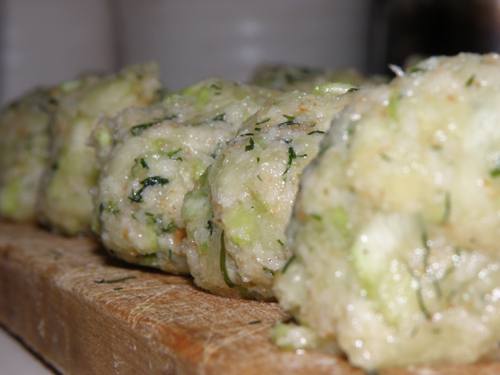 Nu am avut o reteta, dar m-am ghidat dupa cum se fac chiftelutele clasice. Si bine am facut, pentru ca mi-au placut atat de mult incat de atunci am mai repetat figura de cateva ori.