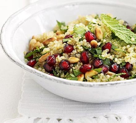 E indicat sa mananci mai multe legume decat carne, o spun specialistii, am simtit-o pe pielea mea. Acum merg sa imi fac o salata de quinoa cu rodie si seminte. Uite cat de bine poate arata: