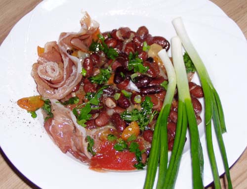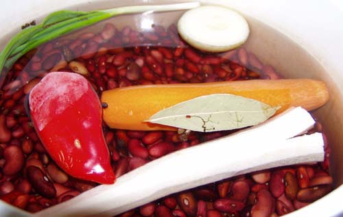 Ingrediente: jumatate de kg. de fasole uscata, 2-3 cepe, 2 morcovi, 2-3 catei de usturoi, o radacina de patrunjel, frunze de patrunjel, un ardei, boia, marar, piper, foi de dafin, maghiran, cateva rosii decojite si o lingura ulei Se pune fasolea la muiat in apa de seara pana dimineata, dupa ce se spala bine in prealabil. Apoi se pune la fiert in multa apa, impreuna cu verdeturile si o ceapa, fara sare. Un secret, pentru ca fasolea sa se inmoaie mai repede, este adaugarea unei lingurite de zahar. Dupa ce fasoalea este fiarta (se gusta), celelalte doua cepe ramase se toaca marunt si se prajesc in putin ulei. Ceapa trebuie sa se inmoaie, nu sa se arda. Dupa aceea se adauga ceapa in fasole, cu tot cu ulei si rosiile taiate cubulete. Se lasa cateva minute sa fiarba impreuna cu fasolea. Apoi se adauga dupa gust: sare, piper, maghiran, marar tocat marunt. Doua linguri de faina si o lingurita de boia se amesteca cu apa pana devin un aluat mai subtire ca si pentru clatite. Amestecul astfel obtinut se toarna in fasole. Se mai lasa la fiert 10 minute timp in care invartim pentru ca faina se poate prinde de fund. Se serveste cu afumatura! 100 de gr. de fasole uscata cu afumatura cotine: 156 calorii; 9,5 g proteine, 1,5 g lipide, 18,2 g. carbohidrati. Tips: Fasolea cu bobul mai mic se fierbe mai usor. Daca doriti sa eliminati faina din compozitie, o puteti inlocui cu 1-2 cartofi fierti si pasati sau cu amidon. Pofta buna! Distribuie articolul pe: