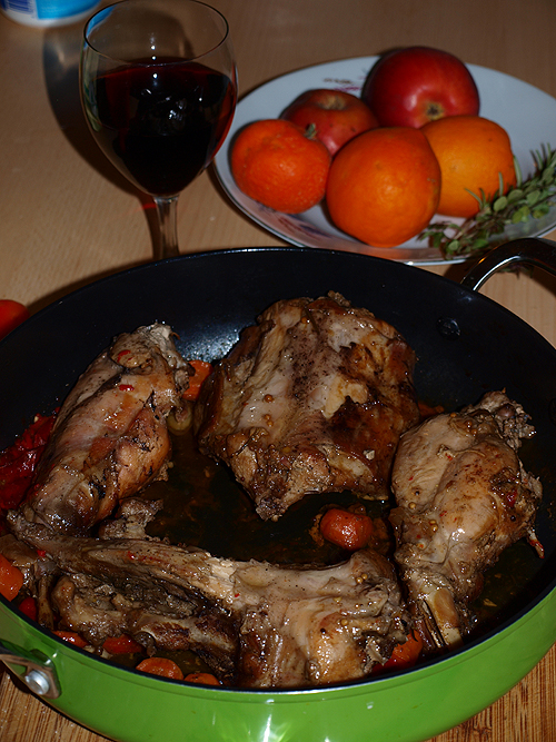 Carnea se spala foarte bine si se portioneaza. Se aseaza intr-o oala antiaderenta impreuna cu condimentele, morcovul, usturoiul, ardeiul si uleiul si se prajesc foarte putin, cateva minute. Se adauga vinul si apa si se lasa la foc mic cu capac, in cuptor, pentru o ora si 45 de minute, timp in care verificam si mai adaugam apa daca este nevoie.