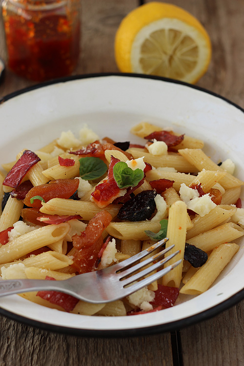 Daca v-ati plictisit de aceleasi retete de paste, astazi vin in ajutorul vostru cu o reteta cel putin interesanta, dulce si iute, de paste cu fructe, pe care am incercat-o si care mi-a placut foarte mult. Sper sa va placa si voua. Ingrediente paste cu fructe: 200 g paste penne 50g caise confiate 50 g prune uscate 2 felii subtiri de sunca afumata jumatate de lingurita de dulceata de ardei iute 2 linguri de ulei 50 g branza de capra Pastele se fierb al dente, conform instructiunilor de pe ambalaj, apoi se strecoara de apa. Caisele si prunele se taie cuburi si impreuna cu sunca si dulceata de ardei iute se calesc in putin ulei. Adaugam pastele si amestecam usor. Sfaramam deasupra branza de capra si servim imediat. 100 de g de paste cu fructe confiate si sunca afumata contin: 385 calorii, 11,5 g proteine, 6 g lipide, 48 g carbohidrati. Distribuie articolul pe: