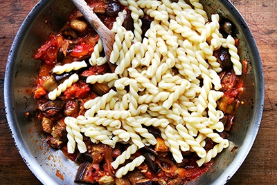 Vrei ceva special? Atunci incearca paste cu vinete. Reteta este simpla, gustoasa si se preteteaza pentru orice ocazie. Este insa excelenta pentru cina, fiind o mancare usoara, care o sa fie si pe placul vegetarienilor. Ca sa faci patru portii de paste cu vinete ai nevoie de 500 de grame de paste (de orice fel), doua vinete mari, o ceapa mare, doi catei de usturoi, o mana buna de frunze proaspete de busuioc, o legatura de patrunjel, sare si piper, o lingura de otet de vin, trei linguri cu pasta de rosii, patru linguri cu parmezan ras, patru linguri cu ulei. Incepe prin a incinge cuptorul. Spala si taie vinetele in cubulete, de dinesiunea unor masline mari. Pune vinetele tocate intr-un vas. Adauga sare si piper, doua linguri de ulei si otetul basamil. Amesteca bine. Pune vinetele intr-o tava intinsa, care merge la cuptor, pe o folie de copt, si coace-le circa 30-45 de minute pana ce se rumenesc si se patrund. Este nevoie sa le intorci o data pentru a se face uniform. Fierbe pastele conform instructiunilor de pe pachet. Cand sunt gata scurge apa dar pastreaza o cana din apa in care au fiert pastele. Cat timp se coc vinetele toaca ceapa pestisori si caleste-o in restul de ulei. Adauga usturoiul tocat marunt si continua sa calesti. Toaca marunt busuiocul si patrunjelul. Adauga ierburile si continua sa calesti. Acum este momentul sa adaugi vinetele coapte. Amesteca si lasa toate ingredientele impreuna pentru cateva minute. Pune pasta de rosii, amesteca bine si stinge cu apa de la paste. Adauga pastele, amesteca incet si mai tine pe foc cateva minute. Da deoparte si adauga parmezanul. Pastele cu vinete sunt gata! O portie are circa 200 de calorii. Distribuie articolul pe: