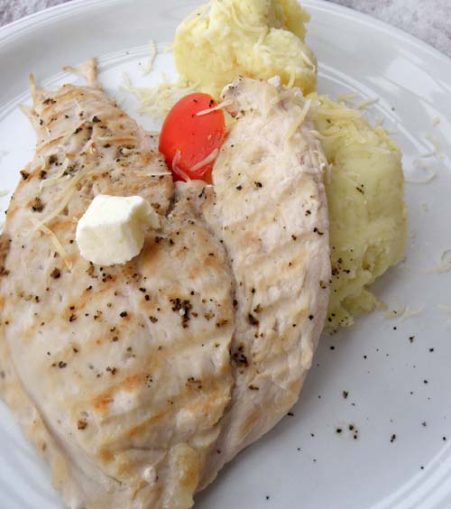Ingrediente: piept de pui , sare, piper dupa gust 10 gr de unt pentru asezonat pentru cartofii piure: 3-4 cartofi 3-4 linguri lapte 1 lingura de unt sare dupa gust Cartofii se curata, se spala si se fierb in paap cu sare pana se inmoaie. Se pasireaza sau se mixeaza impreuna cu laptele si untul. Se sareaza dupa gust. Pieptul de pui se taie file. Se bate pentru a rupe fibra. Se condimenteaza dupa gust. Se aseaza pe gratarul incins. Nu se foloseste ulei sau unt pentru prajit. Daca gratarul este suficient de incins, carnea nu se va lipi. Se lasa maxim 2 minute pe o parte si maxim 1 minut. pe cealalta parte. In acest fel veti obtine o carne moale si zemoasa. Dupa ce carnea a fost luata de pe foc se poate asezona cu putin unt. 100 de g de piept de pui cu cartofi pire contin: 145 calorii, 28 g proteine, 3 g lipide, 7 g carbohidrati. Tips: pentru un piure perfect si pufos este bine sa alegeti cartofii albi. Distribuie articolul pe: