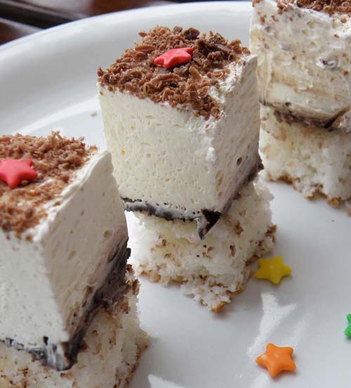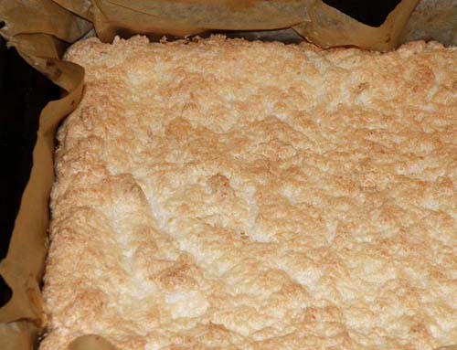 Am facut bineinteles unele modificari si acum mi se pare ca este si mai buna. In primul rand ingredientele din reteta originala sunt insuficiente pentru un blat destul de gros. Dupa cum vedeti in imagini eu am facut-o intr-o tava mica de 20/ 20 de cm pentru ca grosimea blatului sa fie de vre-o 4-5 cm. daca doriti sa faceti intr-o tava mai mare va recomand sa dublati cantitatile. Ingrediente: pentru blat 4 albusuri de ou (de marime medie) 200 gr. de zahar (250 daca ouale au fost mari) 200 gr de fulgi de nuca de cocos pentru crema de vanilie 500 ml lapte 1 plic budinca de vanilie instant 200 ml frisca lichida pentru crema de ciocolata 1 ciocolata amaruie 1 lingurita cafea ness 50 gr. margarina sau unt 3-4 linguri de lapte sau frisca lichida 1 lingura cacao 2 linguri de zahar ciocolata pentru ras deasupra Albusurile de ou la temperatura camerei (este indicat sa le separati de galbenuse cu o zi inainte si sa le scoateti afara din frigider cu vre-o 2 ore sau chiar mai mult inainte de a le bate) se bat impreuna cu zaharul si un plic de zahar vanilat. Este gata atunci cand puteti intoarce oala deasupra capului si nu va treziti cu spuma in par. 😛 Treptat, incorporam fulgii de cocos in spuma de albus, amestecand usor de jos in sus. Asezam compozitia intr-o tava tapetata cu hartie de copt Se da la cuptor la foc mic pentru aproximativ 15 minute. este gata cand nu mai tremura ca o gelatina cand o scuturati putin. Dupa cum vedeti in imagini eu am tinut in cuptor blatul un minut prea mult. Dar e ok. Nu trebuie insa, sa se rumeneasca mai mult de atat. Il punem la racit. Intre timp pregatim crema de ciocolata, care seamana foarte bine cu o glazura delicioasa. Adica punem toate ingredientele pe bain marin si amestecam cu telul pana se omogenizeaza si se ingroasa. O punem si pe ea la racit. Crema este extrem de usor de realizat. Batem frisca si apoi introducem treptat praful de budinca instant, pana se ingroasa compozitia. Peste blatul de cocos se intinde intai crema de ciocolata, apoi cea de vanilie. Se rade ciocolata deasupra. Se mananca aproape instantaneu. Daca nu, se pastreaza obligatoriu in frigider. 100 de g de prajitura de cocos cu crema de vanilie contine: 367 calorii, 4,5 g proteine, 15,5 g lipide, 23 g carbohidrati. Pofta buna! Tips: Crema de vanilie se poate inlocui cu orice fel de aroma doriti, schimband aroma prafului de budinca. Distribuie articolul pe: