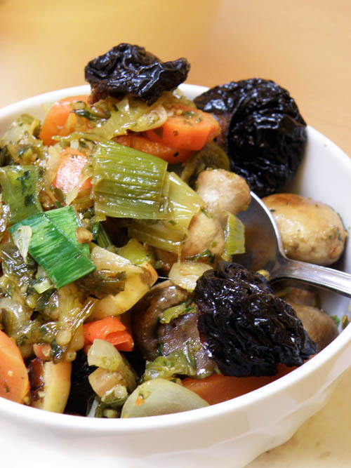 Ingrediente: un pui intreg o mana de prune uscate si afumate o mana de ciuperci champignon o bucata de praz un ardei gras un morcov 2-3 catei de usturoi putin ulei 50 gr. unt sare, piper, mustar alte condimente dupa preferinta 1 cana de apa Puiul se spala foarte bine si se curata de eventuale parti nedorite (varful aripilor, resturi de pene, etc.). Se condimenteaza in exterior si in interior cu sare si piper. Mai puteti adauga si alte condimente, dupa preferinta. Prunele uscate, impreuna cu ciupercile curatate, prazul taiat marunt, ardeiul gras taiat cubulete, morcovul taiat rondele si usturoiul zdrobit, se calesc impreuna in foarte putin ulei, cam 10 minute. Umplem puiul cu aceasta compozitie si il asezam intr-o tava. Ce nu incape din umplutura, putem sa asezam pe langa pui. In tava, turnam o cana de apa. Ungem puiul cu putin mustar. Acesta il va ajuta sa se rumeneasca frumos. Pe sub pielea puiului, putem introduce mici bucatele de unt. Acoperim puiul cu folie de aluminiu si il introducem la cuptor, la foc mic. Puiul trebuie sa stea la cuptor aproximativ 1 h pentru fiecare kilogram. Aa ca daca puiul are 2 kg, va sta la cuptor 2 h. Se mai poate adauga apa daca este nevoie. In ultimele 15 minute se indeparteaza folia de aluminiu. Umplutura se poate servi ca si garnitura. 100 de gr de pui umplut cu prune uscate contine: 342 calorii; 29,3 g proteine; 16,3 g lipide si 3,1 g carbohidrati Tips: Puteti sa umpleti puiul si cu alte fructe uscate, cum ar fi : ananasul sau caise uscate. de asemena, mai puteti adauga si felii de portocale, mar sau gutui. Combinatia de pui cu fructe aromate este delicioasa. Pofta buna! Distribuie articolul pe: