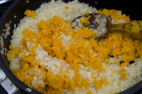 Ingrediente: 350gr orez 2 felii de dovleac O ceapa 2 catei usturoi 2 linguri ulei de masline Un pahar cu vin alb sec 1 l supa de carne sau legume Pentru prima oara in istoria mea culinara am calit ceapa in ulei de masline ceea ce n-a fost chiar asa rau desi aroma este foarte diferita de ceapa calita normal. La ea am adaugat si usturoiul taiat feliute si dovleacul facut piure in robot. Dupa ce s-au calit am adaugat si orezul, am potrivit de sare si piper si am amestecat bine vreo 3 minute, direct pe focul rapid. Apoi adaugam supa si vinul si lasam sa fiarba la foc mic, cu capacul pus. La sfarsit i-am adaugat si jumatate de lingurita de lemongrass pentru aroma. Se serveste cu branza topita deasupra si daca doriti, cu castraveti murati. S-aveti pofta! Timp de preparare: 35min Calorii: 250calorii/portie Portii: 4 Distribuie articolul pe: