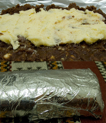 Ingrediente pentru salamul de biscuiti: 500gr biscuiti 400gr zahar 200ml apa 200gr margarina 2 lg cacao o sticluta esenta de migdale Ingrediente pentru crema de cocos: 1 pachet de unt 100gr nuca de cocos 5linguri de zahar pudra Prima oara pregatim crema de cocos. Untul il scoatem din frigider cu vreo 20 minute inainte de folosire si il amestecam bine cu cocosul si zaharul pudra. Eu fac treaba asta cu furculita pentru ca e mai comod decat cu mixerul. Dupa ce s-a format crema delicioasa (atentie – cu cat o gustati mai mult, cu atat preparatul final are de suferit 😛 ) o dam la frigider. Urmeaza sa ne ocupam de biscuiti pe care ii zdrobim pana se fac aproape faina. Daca aveti masina de tocat e grozav, dar eu n-am si ii zdrobesc cu o sticla. Intre timp, punem la fiert zaharul cu apa si se fierb vreo 5 minute. Adaugam margarina taiata bucatele ca sa se topeasca repede si apoi cacao. Amestecam mereu ca sa nu ramana cocoloase de cacao si cand incepe sa bolboroseasca ii punem si esenta de migdale si oprim focul. De-acuma, toata bucataria miroase a marzipan…ceea ce mie mi se pare divin! Urmeaza amestecatura. Daca ati respectat cantitatile, consitenta va fi perfecta. Pe o folie de aluminiu umezita putin intindem amestecatura cu biscuiti. (De fapt, ies doua bucati maricele de salam deci se imparte totul in doua.) Nu e prea usor de intins dar insistam. Deasupra intindem crema de cocos si impachetam bine in forma de rulada cu miez de cocos. Eu am facut si cateva ousoare cu cocos in interior pe care le-am invelit in staniol si le-am facut cadou impachetate frumos. In momentul impachetarii, ousoarele si rulada sunt calde si destul de moi. Totul trebuie sa stea la frigider cel putin o noapte pentru ca impresia finala sa fie perfecta. S-aveti pofta! Distribuie articolul pe: