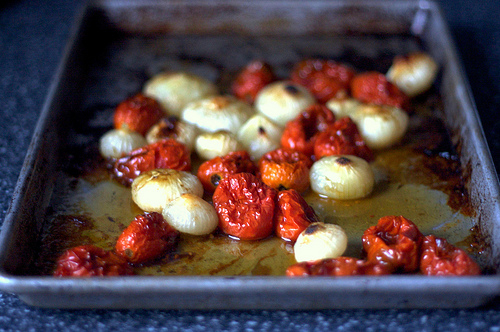 Va propun o salata calda, din ingrediente obisnuite, dar preparata intr-un mod cu totul diferit. Rezultatul este gustos, interesant si deosebit. Salata coapta de rosii si ceapa este potrivita pentru cina, fiind o mancare in sine. Dupa ce o vei face prima data cu siguranta o sa devina una din preferatele tale. In plus rosiile coapte sunt una dintre cele mai importante surse de licopen, un antioxidant foarte puternic si o sursa de sanatate. Ca sa prepari salata coapta de rosii si ceapa ai nevoie de 400 de grame de ceapa (alege sase-opt cepe mai mici), 500 de grame de rosii marunte, 200-300 de grame de fasole boabe fiarta (din conserva), cateva crengute de cimbru proaspat, 5-6 catei de usturoi, sase linguri de ulei, sare, piper, o lingura de suc de lamaie sau otet basamic. Curata ceapa si usturoiul. Spala rosiile. Pune uleiul intr-o tava care merge la cuptor. Aseza in tava rosiile, ceapa si usturoriul intregi. Pune sare si piper si invarte-le in tava astfel incat sa se unga uniform cu ulei. Coace legumele in cuptorul incins bine pentru 30-40 de minute si intoarce-le cu o spatula la fiecare 15 minute astfel incat sa se coaca uniform si sa nu se arda. Pune boabele de fasole intr-un bol, iar deasupra toate legumele coapte. Presara cimbru tocat marunt, sare si piper. Stropeste totul cu suc de lamaie sau otet balsamic si adauga o lingura, doua din uleiul in care au fost coapte legumele. Serveste salata coapta de rosii si ceapa imediat, simpla sau alaturi de felii de paine prajita. Poti adauga in salata bucatele de branza sau cuburi de paine prajita. Salata se poate imbogatii cu felii de ardei coapt sau cu bucatele de vinete si dovlecei. In orice combinatie este delicioasa. Distribuie articolul pe: