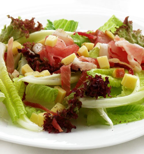 Sunca si cascavalul sunt doar pretext pentru a prepara o salata gustoasa. Asta pentru ca vom pune foarte putina sunca si cascaval. Doar asa, de pofta si pentru a da un gust mai aparte salatei cu sunca si cascaval afumat. Daca sunteti total impotriva puteti sa renuntati la ele. Casa faci salata cu sunca si cascaval ai nevoie de cateva frunze de salata romana, cateva frunze de salata lolo rosie, cateva frunze de salata iceberg, doua-trei felii subtiri de sunca afumata, 50 de grame de cascaval afumat, jumatate de lamaie, o lingura de ulei de masline, sare, piper dupa gust. Frunzele de salata se spala foarte bine, bucatat cu bucata in mai multe ape. Se scutura cat mai bine de picaturile de apa si se rup in bucati cu mana. Se aseaza intr-un bol si se amesteca. Se stropesc cu zeama de la o jumatate de lamaie si cu uleiul de masline. Se adauga cubulete de cascaval si fasii mici de sunca afumata. Se asezoneaza totul cu sare si piper. Se serveste imediat. 100 de grame de salata mixta cu sunca si cascaval afumat contine: 62 calorii, 7 g proteine, 5 g lipide si 5 g carbohidrati. Distribuie articolul pe: