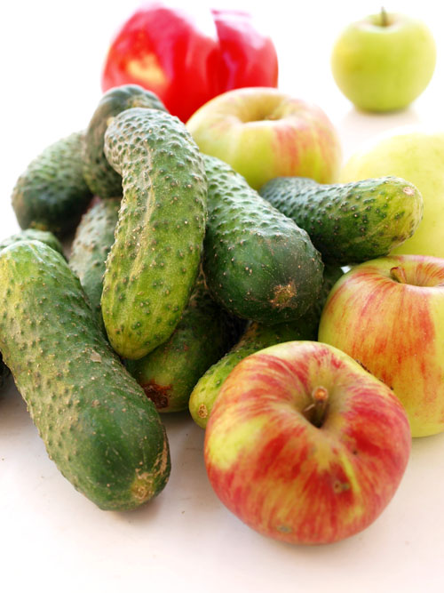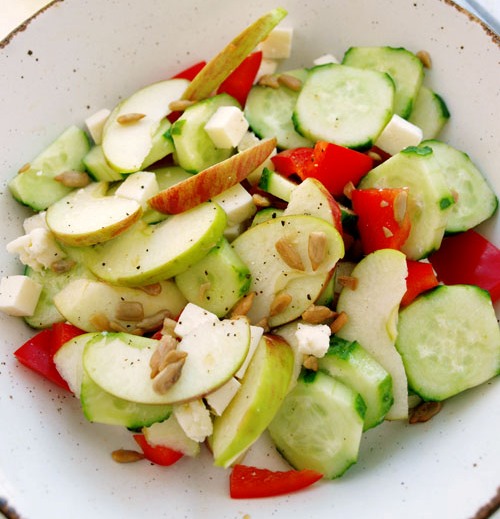 V-am mai povestit ca imi place sa improvizez cand este vorba de salate. Ei bine, salata de castraveti mere si feta despre care va voi vorbi mai jos, m-a surprins intr-un mod foarte placut. A fost prima data cand am combinat merele cu castravetii si va spun ca se potrivesc perfect. Merita sa incercati! Ca sa o faci ai nevoie de trei mere, trei-patru castaveti mici, 50 de grame de branza feta, doua lingurite seminte de floarea soarelui, o lingura de ulei de floarea soarelui presat la rece, un ardei rosu dulce sau un gogosar, sare si piper dupa gust, o lingura cu zeama de lamaie. Fructele si legumele se spala foarte bine. Daca eeste nevoie, merele si castravetii se curata de coaja. Eu am preferat sa curat doar catravetii, partial. Am taiat merele felii si catravetii rondele. Ardeiul rosu se taie cubulete si branza feta la fel. Branza se poate inlocui cu telemea sau se poate elimina daca sunteti vegetarieni convinsi. Am stropit totul cu putina zeama delamaie, pentru ca marul sa nu se oxideze, apoi am adaugat si putin ulei de floarea soarelui preset la rece – are o aroma extraordinara. Am presarat deasupra niste seminte putin prajite, tot de floarea soarelui si am asezonat cu sare si piper dupa gust. 100 de g de salata de castraveti cu mere si feta contine: 64 calorii, 2 g proteine, 3 g lipide si 11,4 g carbohidrati. Distribuie articolul pe: