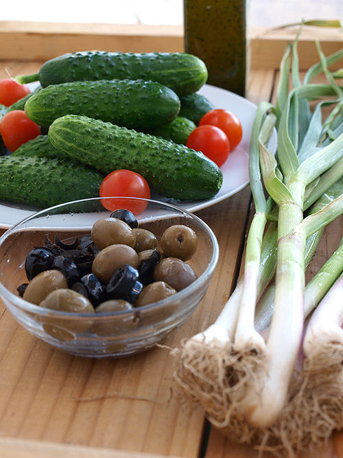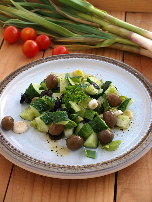 Este fascinant sa incerci cat mai multe combinatii noi de gusturi si arome, iar salatele sunt perfecte pentru asta, asa ca m-am gandit la o salata de castraveti cu masline. Nu au cum sa iasa gresit, mai ales atunci cand folosim ingrediente de calitate. De asemenea putem sa facem diverse combinatii de gusturi intre alimente care ne plac si pe care de obicei le consumam separat. Eu am facut astazi un experiment cu ingrediente de primavara si masline. Ingrediente: 3 castraveti, 5 rosii cherry o mana de masline verzi, un fir de usturoi verde, o lingura de ulei de masline extravirgin aromat cu busuioc, sare si piper, dupa gust, cateva picaturi de otet balsamic sau zeama de lamaie Mod de preparare: Legumele se spala foarte bine. Fiind tinere si proaspete nu este neaparata nevoie sa le curatam de coaja – aici ma refer in special la castraveti pe care ii taiem cubulete mici. Rosiile le taiem in doua sau in patru, in functie de marime. Indepartam varfurile verzi ale usturoiului iar apoi il taiem marunt. Amestecam usor toate ingredientele si adaugam maslinele. Este preferabil sa folositi masline fara samburi. Stropiti totul cu ulei de masline extravirgin aromat cu busuioc si cateva picaturi de otet balsamic de calitate. Daca nu va place il puteti inlocui cu putina zeama de lamaie. Lasati cinci minute, sa se intrepatrunda gusturile apoi serviti imediat. 100 de g de salata de castraveti cu usturoi verde si masline contin: 44 calorii, 1 g proteine, 3 g lipide si 11,1 g carbohidrati. Pofta buna! Distribuie articolul pe: