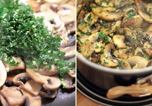 Toaca ciupercile in bucati mari, toaca marunt usturoiul si patrunjelul, stoarce sucul de lamaie si rade putina coaja de lamaie (un varf de lingurita). Pune uleiul la incins si adauga ciupercile si usturoiul. Amesteca si adauga un strop de sare (cu grija pentru ca pastele au fiet in apa cu sare). Caleste bine pana cand ciupercile lasa suc si se inmoaie. Adauga patrunjelul, o lingura de suc de lamaie, putina coaja de lamaie si patrunjelul tocat. Amesteca. Adauga piper mult, proaspat macinat. Rastoarna totul peste paste, inclusiv sosul. Amesteca usor si serveste imediat. Un pahar de vin alb, demi-sec, merge de minune alaturi.