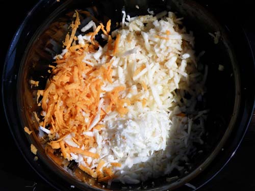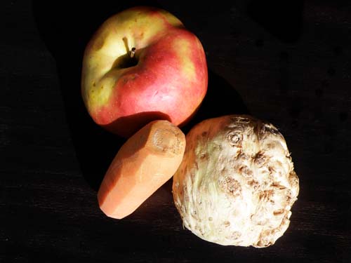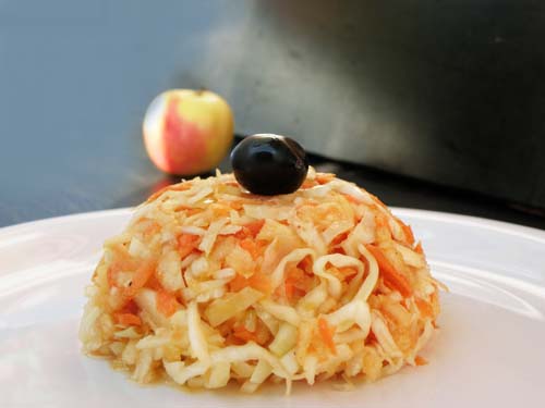 Probabil ca era super-tratat cu tot felul de consrvanti si chimicale. Ce sa fac cu el? Nu prea mi-a venit sa il mananc… parca era de plastic. Dar cum sa arunc frumusete de mar? M-am gandit, m-am uitat in frigider si mi-am zis ca ar trebui sa fac totusi ceva cu el. aas ca am hotarat sa fac o salata de cruditati. Aveam niste morcovi, varza si telina cumparate din piata, si suta la suta romanesti si ecologice. Mi-am zis ca ar fi o combinatie buna si parca ingredientele suta la suta romanesti ar mai spala din pacatele marului perfect. A iesit o salata minunata pe care insa va sfatuiesc sa o preparati cu mere autohtone, mult mai gustoase si mai sanatoase. Ingrediente: 1 mar mare (2-3 mai mici) 1 morcov mare jumatate dintr-o varza dulce mica (optional) jumatate de radacina de telina jumatate de pahar cu apa 1 lingura zahar jumatate de lamaie 1 lingurita rasa de sare 2 lingurite ulei de masline piper dupa gust Prima data preparam dressing-ul din jumatatea de pahar cu apa, zaharul, sarea, zeama de la lamaie si uleiul de masline. Il amestecam bine pana se topesc toate granulele de sare si zahar. Adaugam piper dupa gust. Varza o taiem julien, cat de subtire putem. Marul, morcovul si telina le spalam, le curatam si le dam pe razatoarea mare. Marul va fi ultimul razuit pentru ca este cel care se oxideaza cel mai repede. Asta in cazul in care marul este ecologic, pentru ca in cazul marului meu nu a fost nici o problema. Merele astea perfecte pot fi tinute fara coaja chiar si cateva ore si tot nu se oxideaza. Si asta nu cred ca este un lucru bun. Amestecam toate legumele si marul si adaugam dressing-ul. Amestecam bine. Pastram salata la frigider pentru cel putin jumatate de ora inainte de a o servi. 100 de grame de salata de cruditati contine: 34,2 calorii, 0,2 grame lipide, 0,8 grame proteine, 7,1 gr. carbohidrati Pofta buna! Tips: daca apa cu care faceti dressing-ul este putin calduta, zaharul si sarea se vor topi mai usor. Distribuie articolul pe: