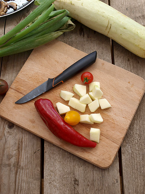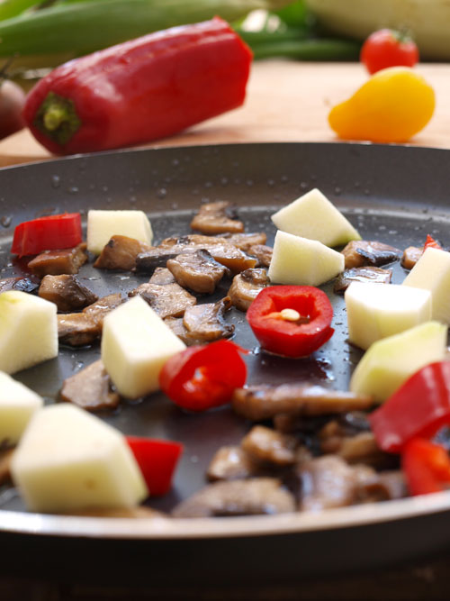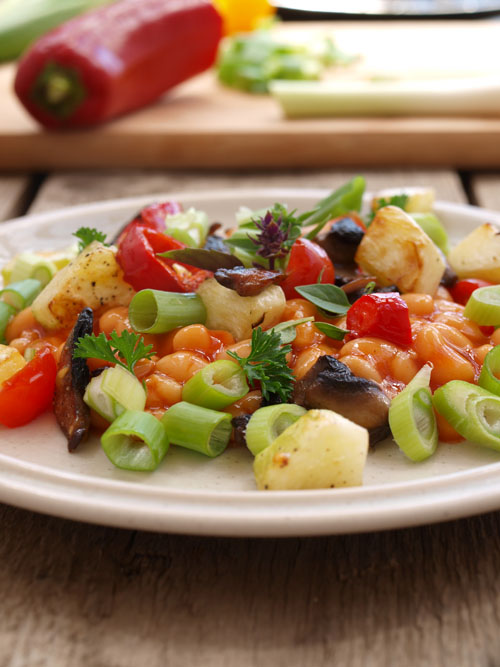 Daca aveti pofta de ceva picant, dar nu vreti sa abuzati de carne, va propun o salata de legume cu chili, usor de preparat si la fel de interesanta din punct de vedere gustativ ca orice friptura. Eu va arat varianta mea, dar voi puteti sa folositi orice legume aveti la indemana. Ingrediente: 100 de grame de fasole fiarta in sos tomat din conserva, 2-3 ciuperci proaspete, jumatate dintr-un dovlecel mic, jumatate dintr-un ardei rosu, 2-3 linguri de ulei, jumatate de lingurita pasta de chili, un fir de ceapa verde, 4-5 rosii cherry, frunze proaspete de busuioc si patrunjel, sare, piper dupa gust. Am taiat ciupercile marunt si le-am pus la prajit ntr-o tigaie cu putin ulei pentru 2 minute. Am adaugat dovlecelul si ardeiul taiate cubulete respectiv rondele. Le-am mai lasat inca un minut. Imediat ce dovlecelul a primit putina culoare, am adaugat si pasta de chili, rosiile cherry, am condimentat cu sare si piper si am stins focul. Am taiat ceapa verde marunt, cu tot cu coada verde. Am adaugat-o peste amestecul de mai sus. Le-am pus pe toate intr-un bol in care am adaugat si fasolea. Am amestecat usor si am decorat cu frunze proaspete de patrunjel si busuioc. Am servit imediat, dar se poate servi si rece. 100 de g de salata de legume cu chili contine: 143 calorii, 19,1 gr proteine, 1,7 gr. lipide si 8,1 gr carbohidrati Pofta buna! Distribuie articolul pe: