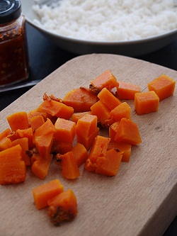 In asteptarea primaverii m-am gandit sa mai profitam putin de ingredientele de sezon de care ne va fi dor in curand. Asa ca am ales dovleacul ca vedeta a acestei retete de salata de orez . Are putine calorii, este foarte gustos, iar intr-o combinatie picanta este o gustare inedita.