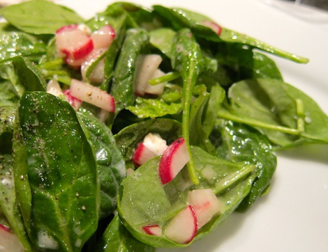 Pentru ca e sezonul verdeturilor, azi va recomandam o delicioasa salata de spanac cu ridichi si ceapa verde. Ingrediente: – 2 legaturi de spanac; – o mana de salata verde; – 2 legaturi de ridichi; – o lingura suc de lamaie; – o lingura otet de mere sau suc de rodii; – 2-3 fire de ceapa verde; – un morcov taiat fasiute subtiri; – 2-3 linguri ulei de masline; – sare si piper dupa gust; – seminte (optional); – branza (optional). Mod de preparare: Tocati ingredientele cat de marunt va place. Puteti adauga seminte de floarea soarelui, seminte de susan sau ce alte seminte va plac. Daca nu tineti post, puteti adauga si niste branza. Merge foarte bine. Pofta buna! Distribuie articolul pe: