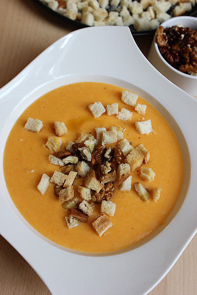 O mancare de post este intotdeauna binevenita in sezon, asa ca m-am gandit la o reteta noua, de supa crema de morcovi si cartofi cu nuci si crutoane, care sa va fie de folos, dar in acelasi timp sa fie si satioasa si sanatoasa. Cu frigul neobisnuit din perioada asta, va recomandam sa po serviti calda. Puteti sa adaugati sau sa inlocuiti morcovii cu telina de exemplu, daca va place sau pentru a diversifica. Este foarte usor de preparat si sper sa va placa. Ingrediente pentru supa crema de morcovi si cartofi cu nuci 3 morcovi 3 cartofi 1 litru si jumatate de apa 1 felie de paine Sare, piper dupa gust O lingura de otet Cateva nuci Putin ulei de dovleac. 1 ceapa mica Mod de preparare Curatati legumele si spalati-le bine, apoi taiati-le cuburi mari si puneti-le la fiert in apa. Intre timp pregatiti curutoanele. Taiati felia de paine in cubulete mici pe care puneti-le intr-o tava, in cuptor, pentru cateva minute sau pana cand se rumenesc putin. Dupa ce legumele s-au fiert, pasirati-le cu blenderul, fara a strecura apa in care au fiert. Adaugati sare si piper dupa gust. Serviti cu crutoane si nuci, iar la final stropiti cu putin ulei de dovleac. 100 de g de supa-crema de morcovi si cartofi cu nuci si crutoane contin: 65 calorii, 1,9 g proteine, 1,2 g lipide si 28 g carbohidrati. Pofta buna! Distribuie articolul pe: