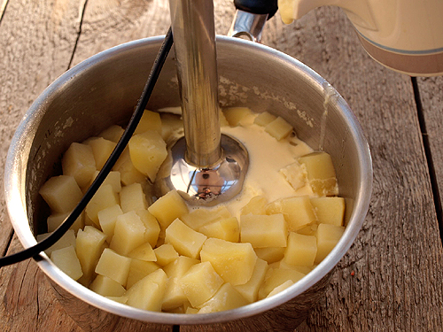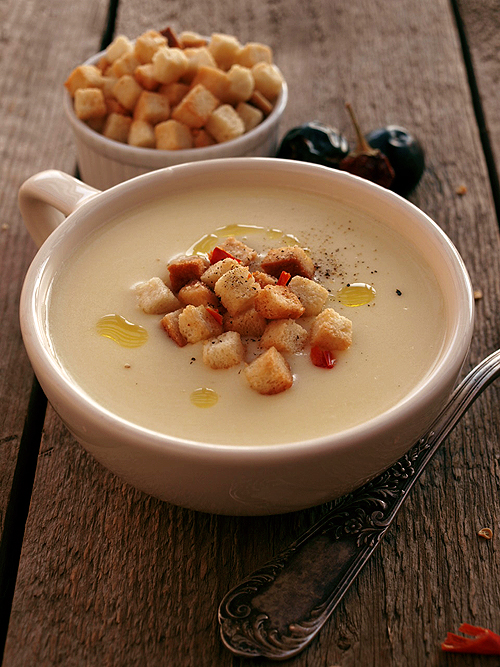 Supele crema sunt delicioase, sanatoase si iti incalzesc trupul si sufletul in zilele reci si umede de toamna amestecata cu iarna. Supa crema de cartofi este una din cele mai usoare de preparat. Ca sa o faci ai nevoie de 500 grame de cartofi, 50 de mililitri lapte, sare dupa gust, doi litri de apa, 100 mililitri de smantana si o felie de paine pentru crutoane. Cartofii se curata se spala si se taie cubulete. Punem cartofii la fiert in apa cu putina sare, la foc mediu, pentru aproximativ 20 de minute pana se fierb bine ca si pentru un piure. Dupa ce s-au fiert, se scurg de apa, se adauga laptele si smantana si se mixeaza cu blenderul pana cand obtinem o crema. Daca compozitia este prea groasa, mai adaugam putin din apa in care am fiert cartofii. Crutoanele se obtin foarte usor. Taiem cubulete mici o felie de paine, le punem intr-o tava pe hartie de copt si le dam la cuptor pentru 10 minute (in functie de cat sunt de mici) sau pana cand devin aurii. Crutoanele le adaugam in supa in momentul servirii. Putem asezona tot atunci cu piper si sare daca mai este nevoie. 100 de grame de supa crema de cartofi cu curtoane contine: 92 calorii, 1,9 g proteine, 0,4 g lipide si 20,1 g carbohidrati. Pofta buna! Distribuie articolul pe: